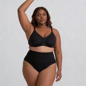 That happens when shapewear compresses everything the same — squeezing the belly pushes fat upward and outward. Curvée uses graduated compression panels that smooth the belly without displacing it. Wide waistband, high rise, no new bulges created. Just a cleaner line under your clothes.